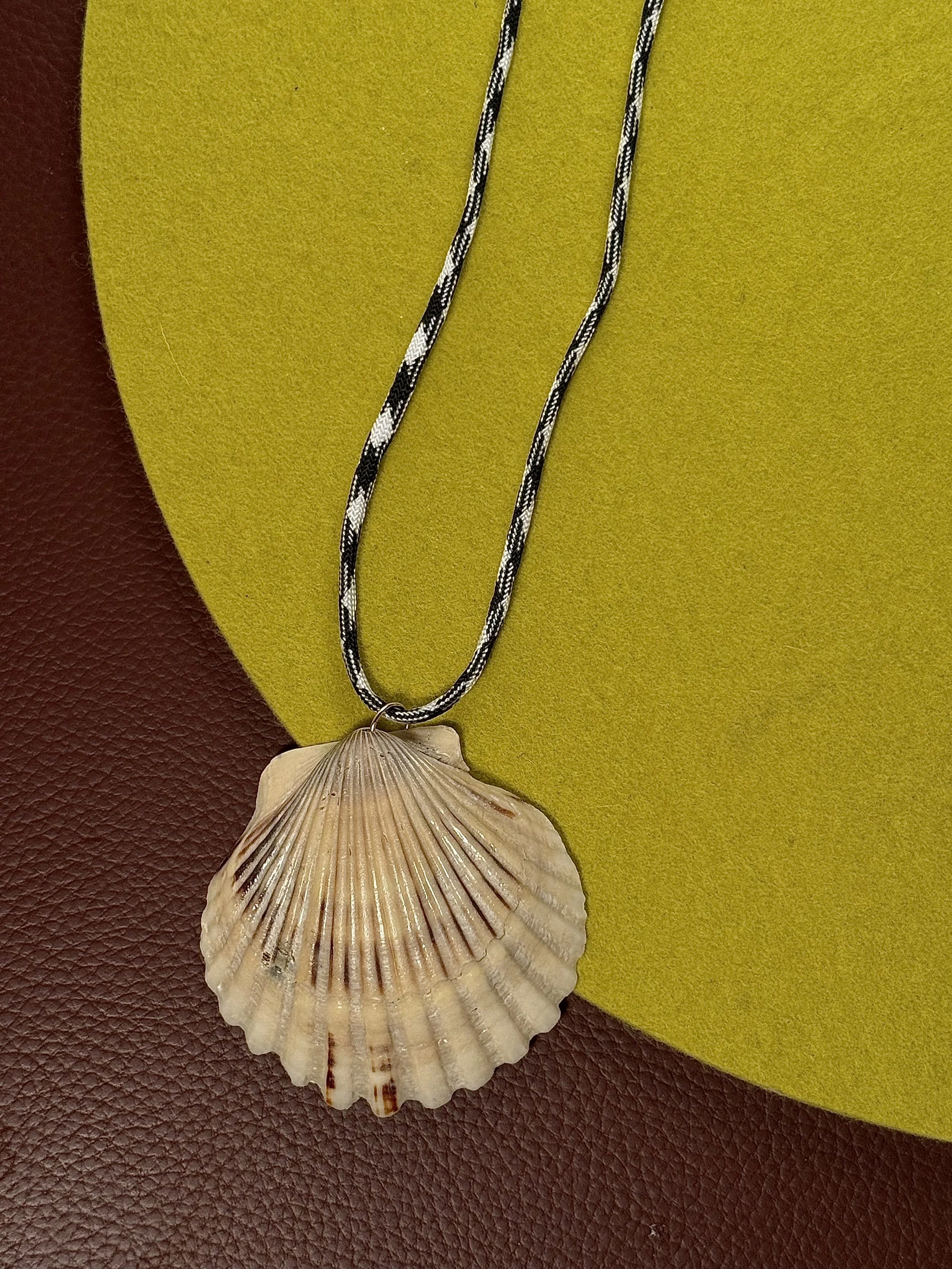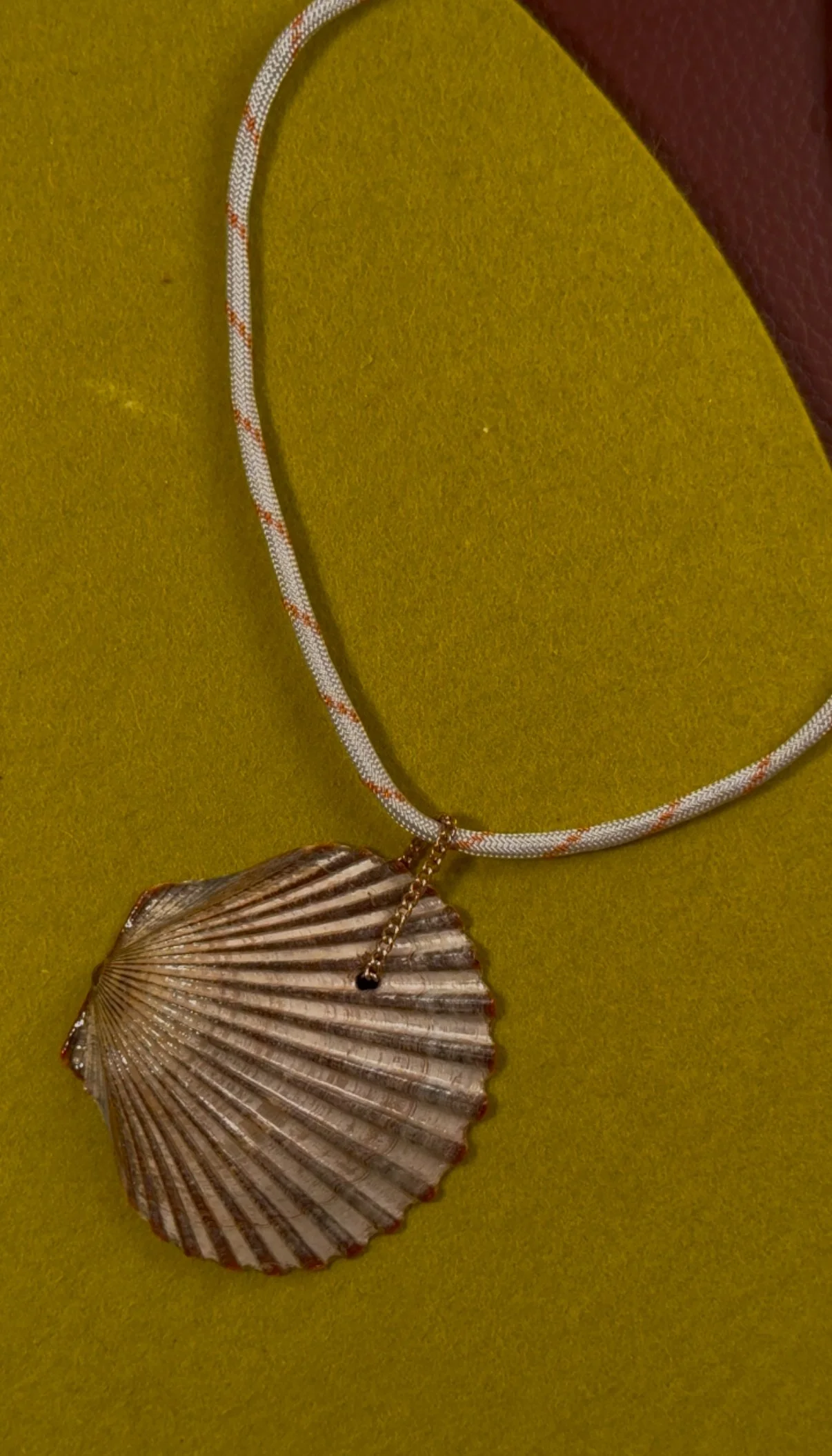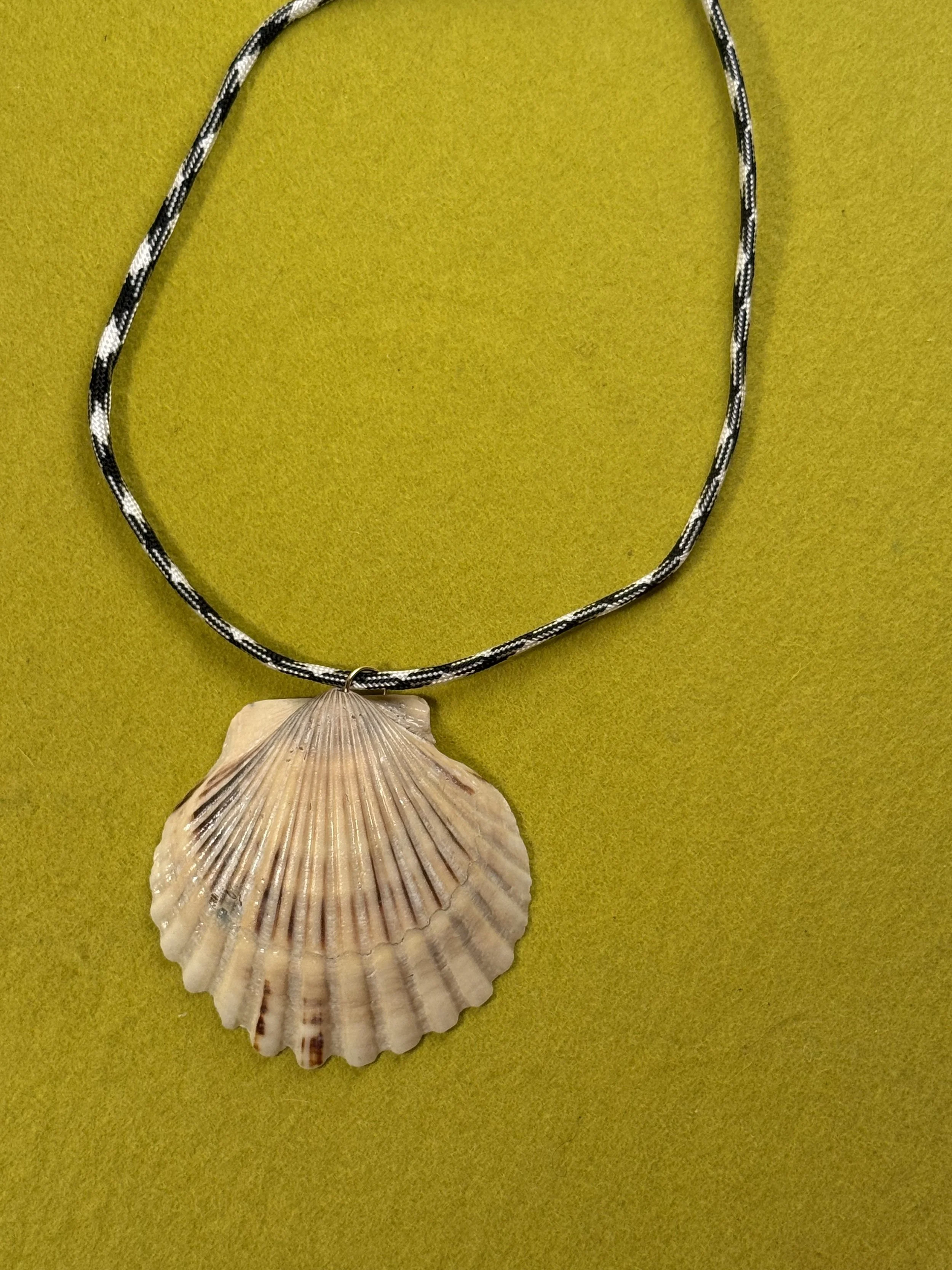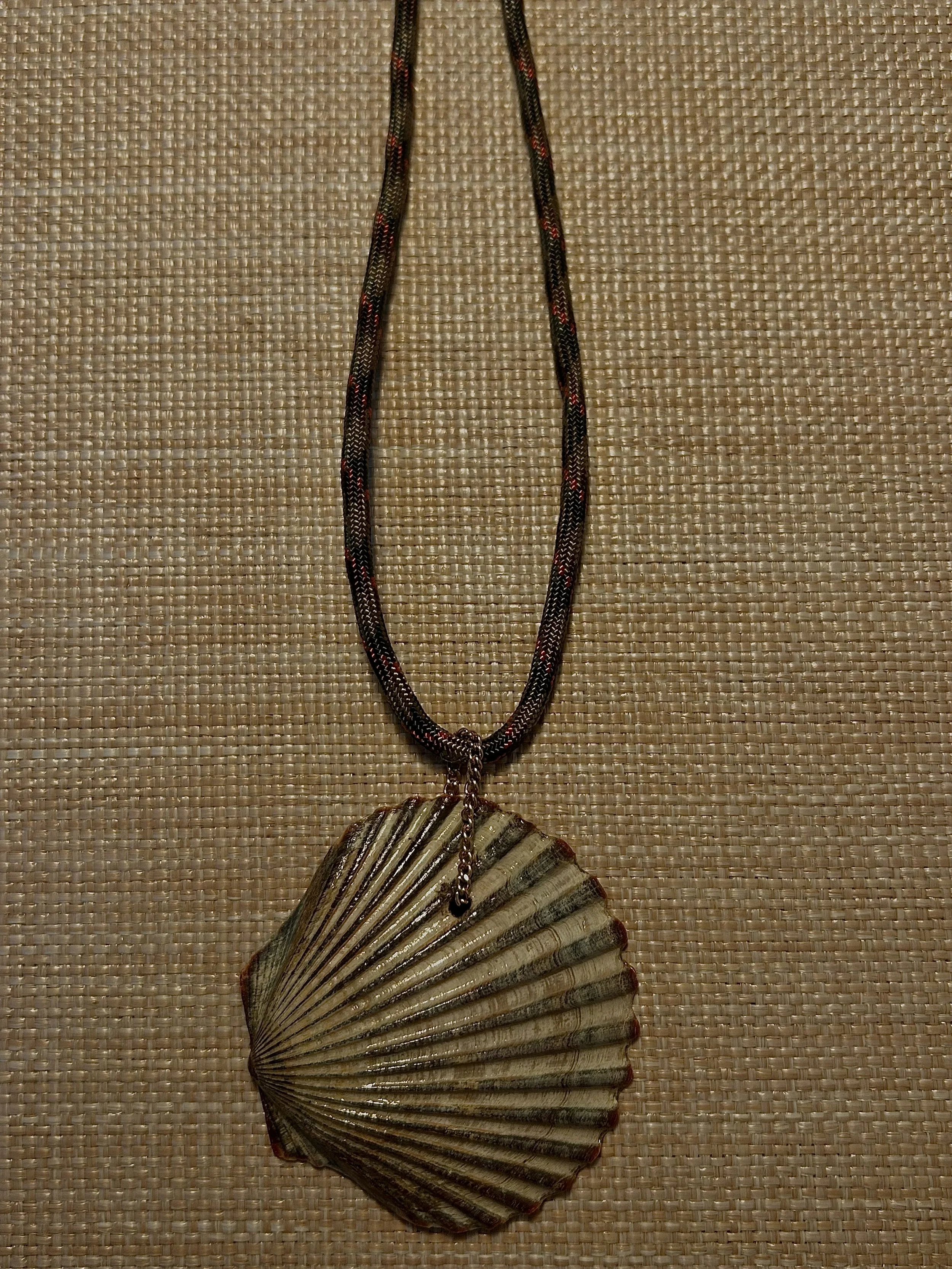 Our most iconic piece: The Amagansett Necklace is made using a large natural scallop shell, lacquered to prevent breakage, and strung on a section of paracord measuring 16”.