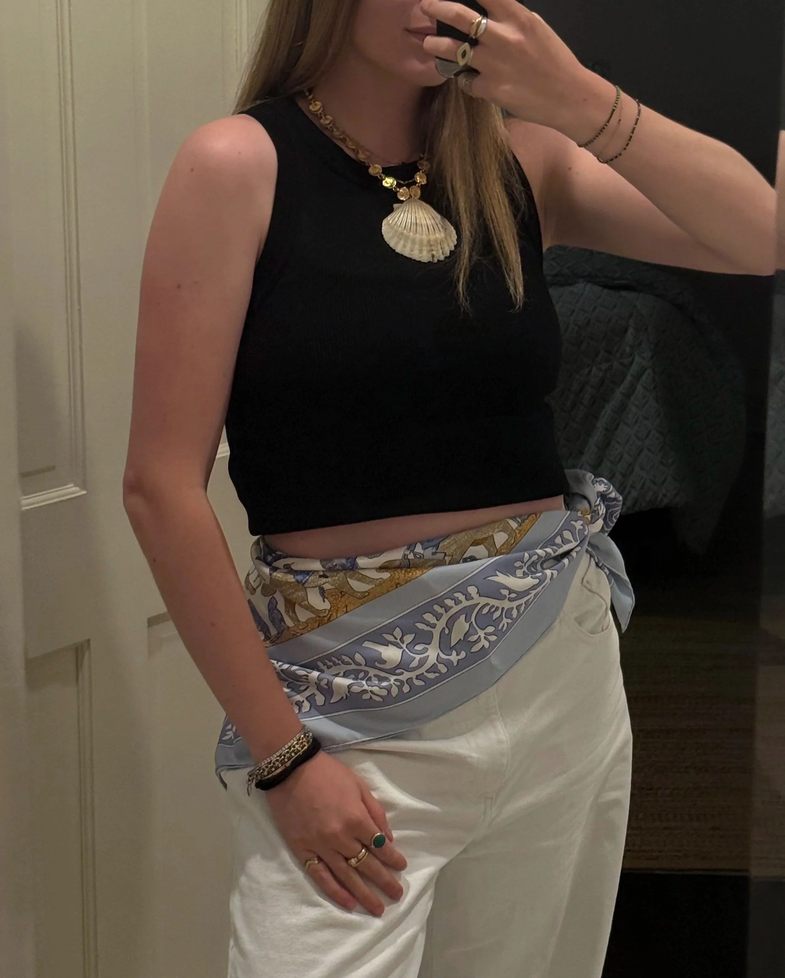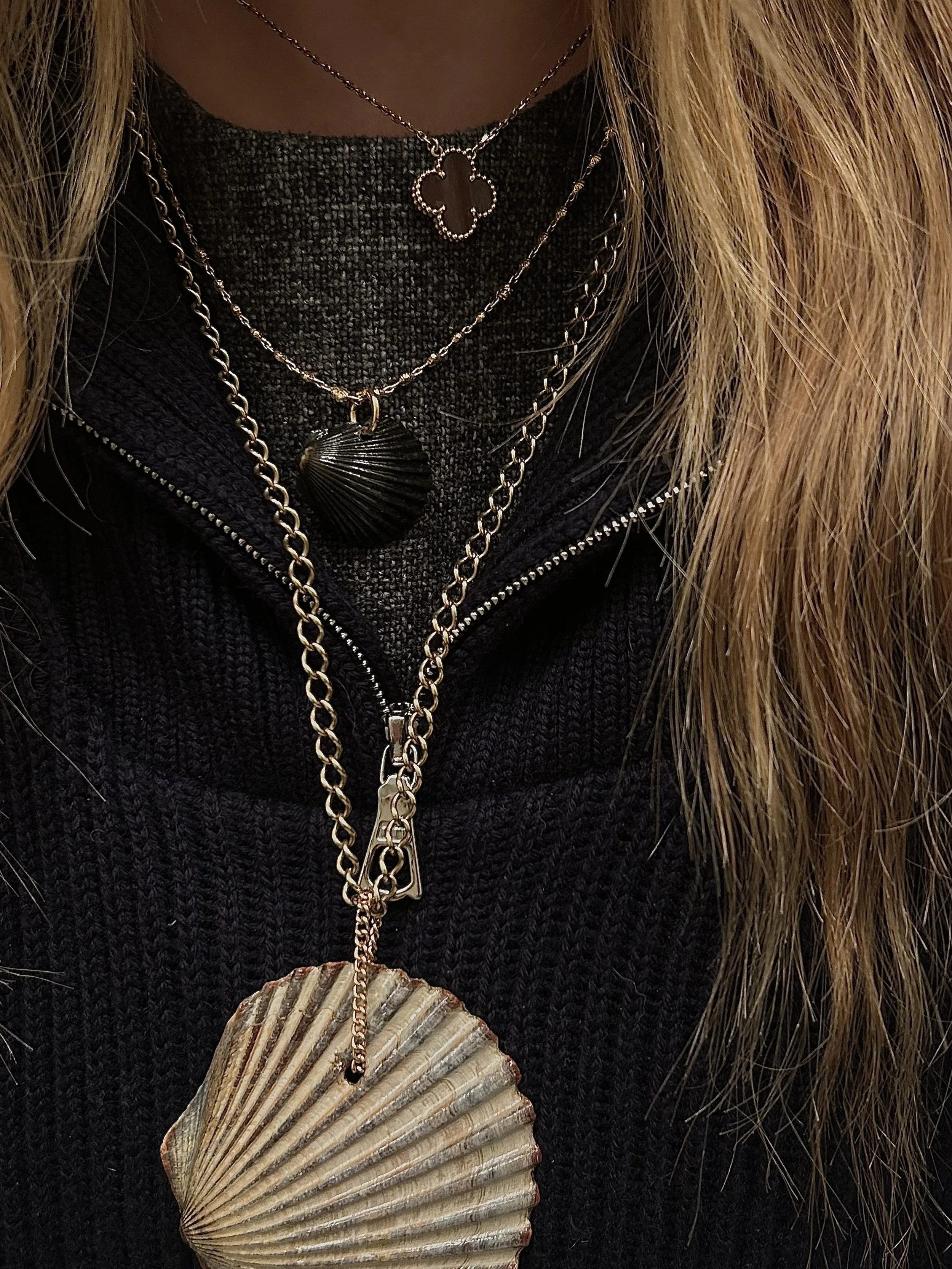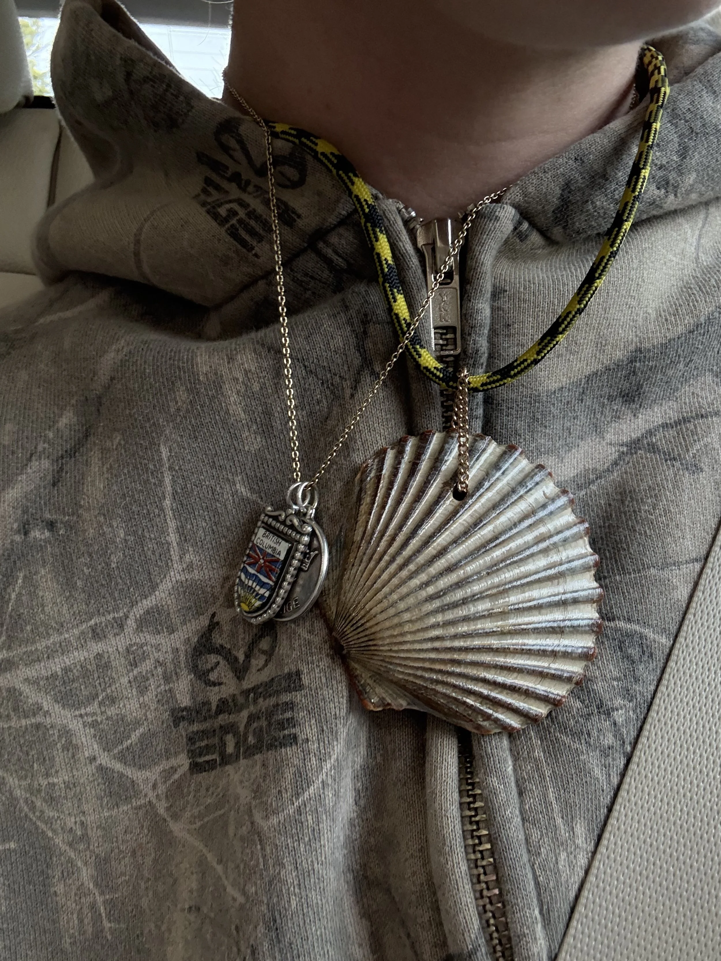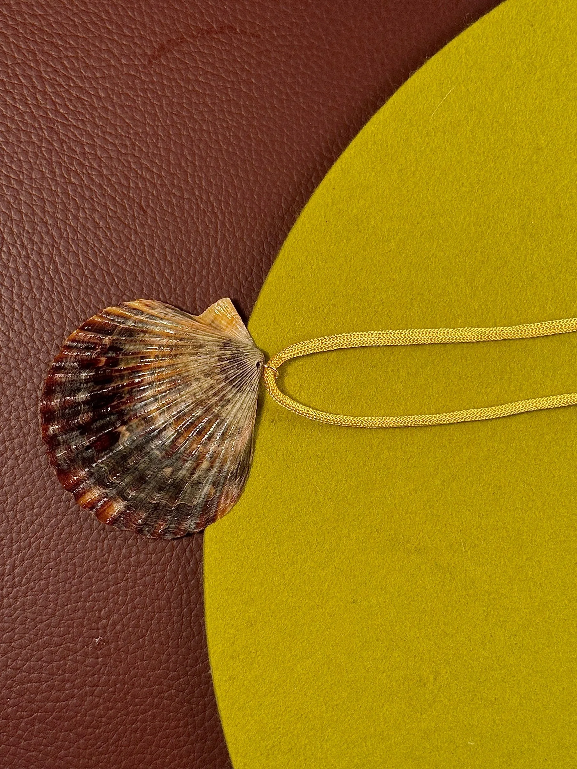 Our most iconic piece: The Amagansett Necklace is made using a large natural scallop shell, lacquered to prevent breakage, and strung on a section of paracord measuring 16”.