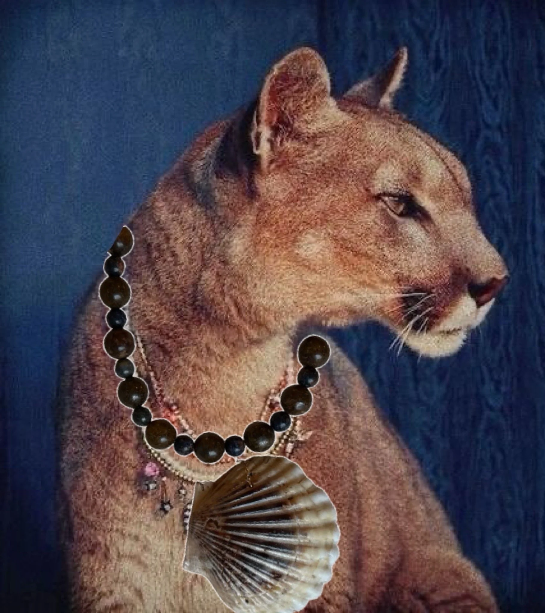 A natural, white and brown scallop shell, brushed with lacquer to prevent breakage and paired with a necklace made of natural Agate and Labradorite beads strung on elastic cord.